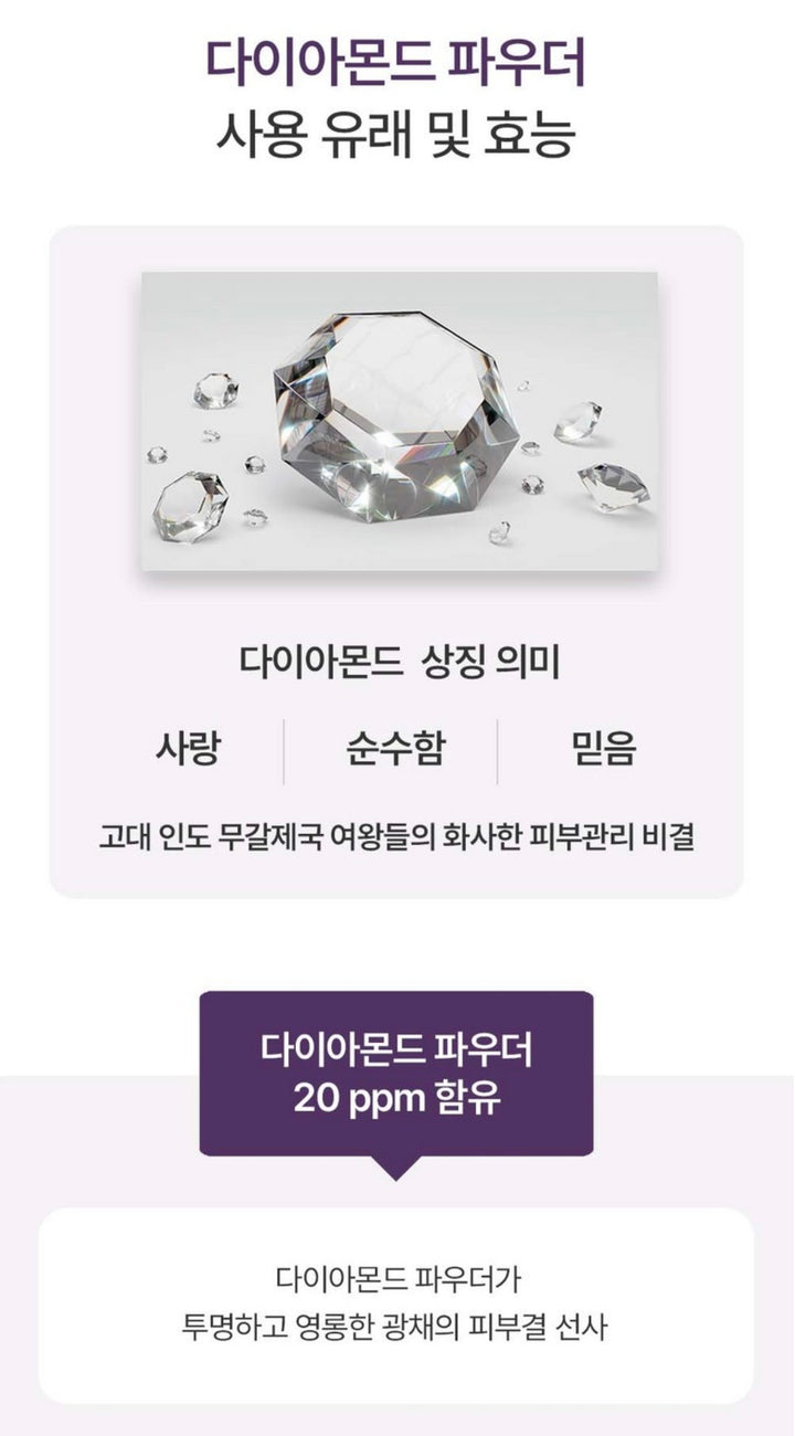 Formulated with natural Diamond Powder (20ppm) and over 60 nourishing ingredients including Vitamins, Collagen, Hyaluronic Acid, and Peptides, it provides rich hydration and care for smooth, luminous skin.